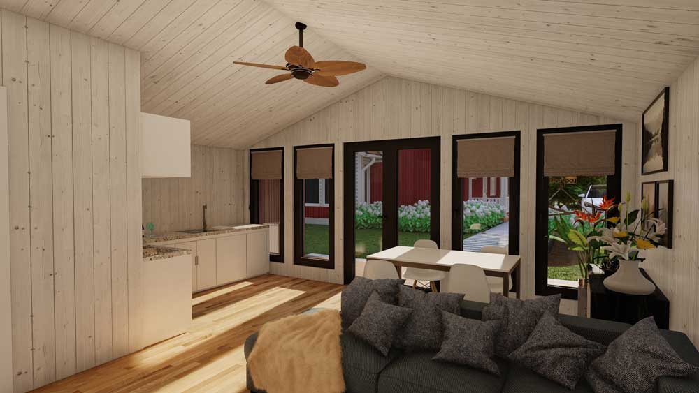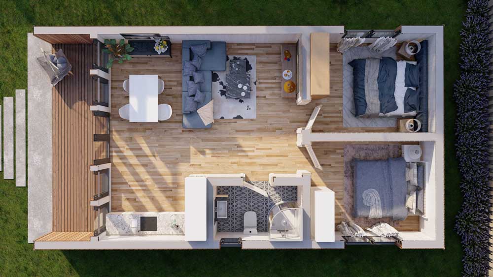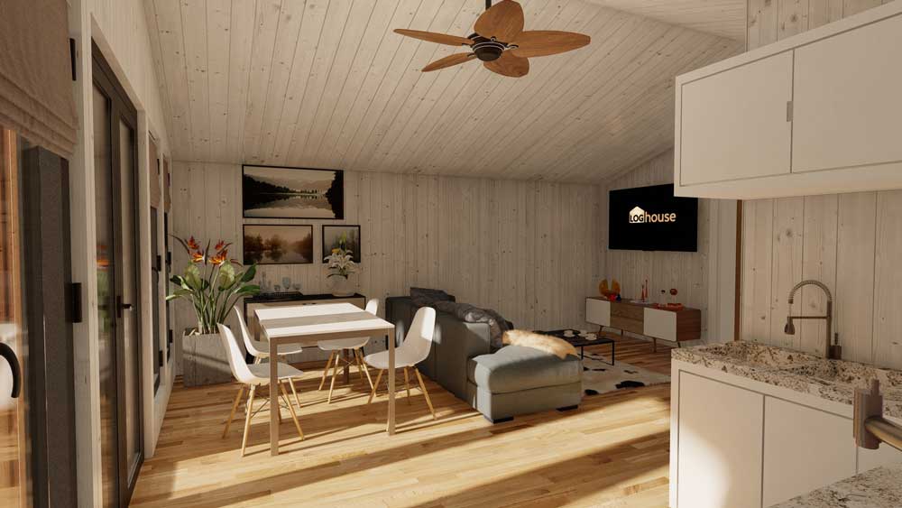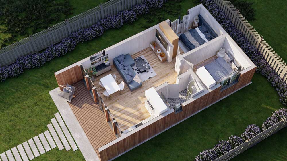 Loghouse.ie is proud to present our new range of Eco Residential Chalets. All Eco Two Bed’s are made from SIP (Structural insulated panels) with roof, floor and wall insulation. Grey UPVC double glazed windows and doors come as standard. Fitting is also included in the price.
