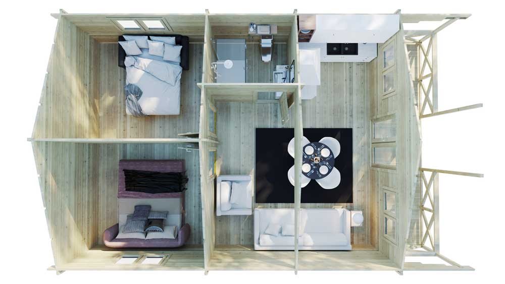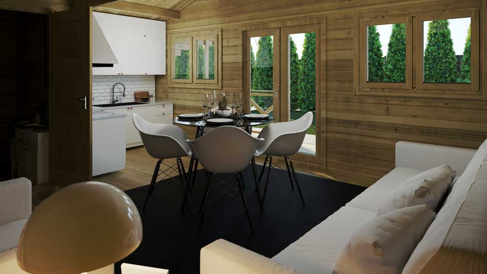 Two bed type C log cabin is our top selling two bedroom residential log cabin. Our clients value this log cabins open plan living room and kitchen area with big bathroom and two big bedrooms. Loghouse has high standards for residential log cabins therefore our two bed type C log cabin comes with insulated floors, insulated roof, steel roof tiles, damp proof membranes on roof and foundation. The log cabin log thickness is 60mm and on client request log cabin can be insulated with 100mm of mineral wool with 19mm internal timber cladding. This setup makes walls 179mm thickness and very warm in winter and cool in summer. Our walls insulated from the inside, the advantage of such a setup is to hide all electric wiring inside the walls and leave log cabin very clean looking.